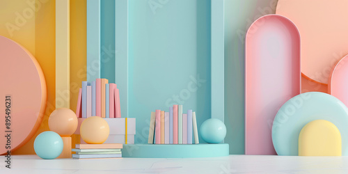 Fototapeta premium abstrakter Fotohintergrund mit Kinderbuch und fantasievollen und verspielten Elementen, fröhliche und farbenfrohe Töne, minimalistischer Stil, sanfte Farbverläufe