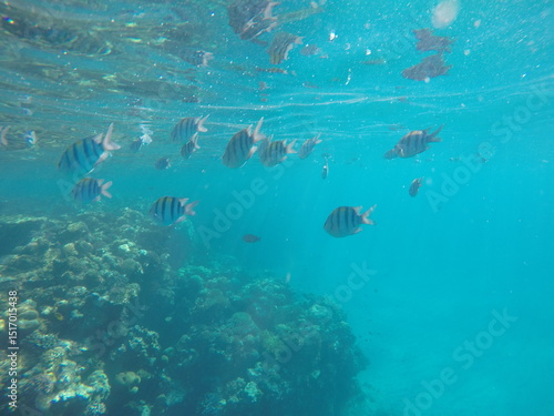 Fototapeta premium Abudefduf fish, commonly known as sergeant major fish, is a brightly colored reef fish often found in the Red Sea, including the coastal waters of Egypt. These fish are small but easily recognizable d