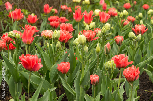 © claire, Obraz premium Abundant colorful Tulip flowers in springtime in the rain background