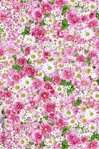© Sarinya, Naklejka premium Abundant Pink and White Floral Display Overhead Shot Featuring Roses Daisies and Small White Flowers