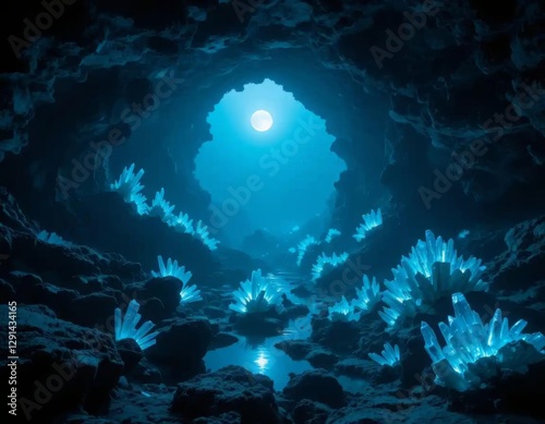 Fototapeta premium Abyssal azure moonlit cavern with bioluminescent crystals