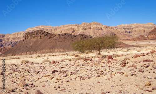 Fototapeta premium Acacia Tree in Timna Park in Israel surrounded by different colored hills and...