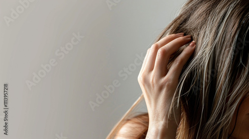 Obraz premium Acceptance of gray hair as a part of life's journey. Hair coloring in salon. Woman's head with strands of gray hair starting to appear. Stress about aging process and transition to gray hair.