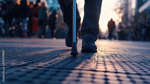 © HPMP Studio, Fototapeta premium accessibility and friendly environment concept, Close-up of a blind man walking along a tactile tile with a can