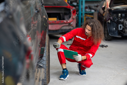 Obraz premium Accident Inspector Inspect damage car caused by car crash on the road. Car insurance agent examining car by Claim form clipboard in garage. Motor insurance