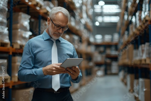 © Zaleman, Fototapeta premium Accounting and bookkeeping in warehouses. An older man checks his statements for the presence of goods using a tablet computer.