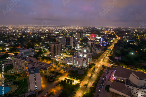 © Roger, Fototapeta premium Accra, Ghana at night, aerial view of city lights and urban landscape under a twilight sky.