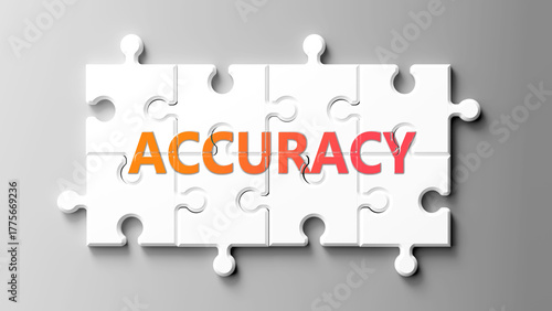 Fototapeta premium Accuracy complex like a puzzle - pictured as word accuracy on a puzzle pieces to show that accuracy is complex and needs cooperating pieces that fit together. ,3d illustration