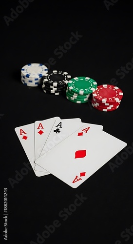 © Sunan, Obraz premium Aces High - Poker Hand with Chips on Black Background, Casino Night.