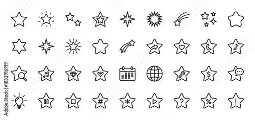 © PixeloAI, Fototapeta premium Achievement and rating outline icon set. Vector pictograms of stars with various decorations, calendar, bulb, globe, and musical notes, thin linear illustration.