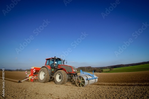 Fototapeta premium Ackerbau, bei der Getreideaussaat, Weitwinkelaufnahme