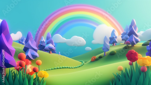 Fototapeta premium Ackgrounds landscape grassland panoramic. Vibrant Rainbow Arching Over Lush Green Forest After Gentle Rain Shower