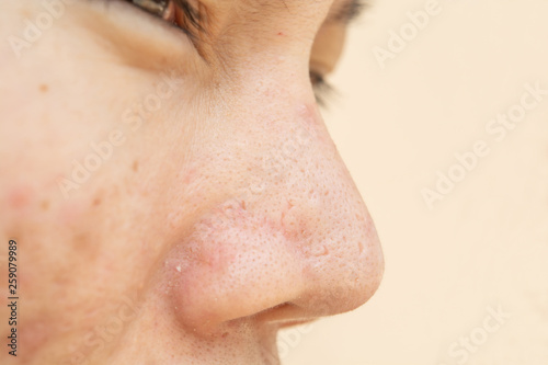 © srisakorn, Obraz premium Acne scars and pores. In the nose Black spots, wrinkles and skin problems