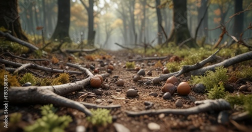 © The Art of AI, Obraz premium Acorns and sticks on forest ground amidst fallen branches, woodlands, forest ground