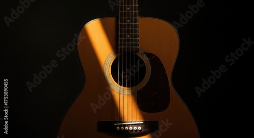 © Gilang, Fototapeta premium Acoustic guitar bathed in dramatic sunlight against a dark backdrop.