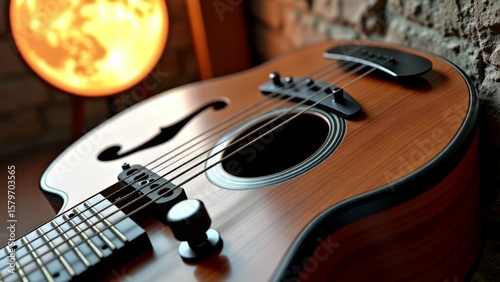 © PixelMastery , Fototapeta premium Acoustic guitar close-up in music studio