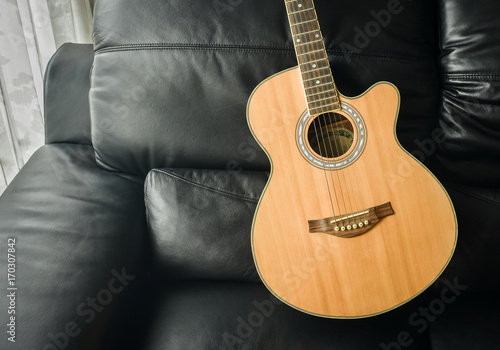 Fototapeta premium Acoustic guitar laid on black leather sofa by the living room window.