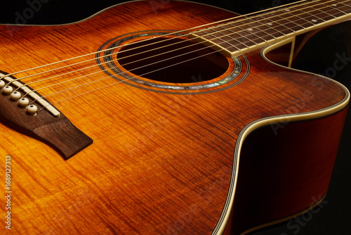 Fototapeta premium Acoustic guitar lying on dark background
