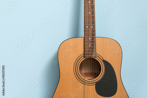 Obraz premium Acoustic guitar near color wall, closeup