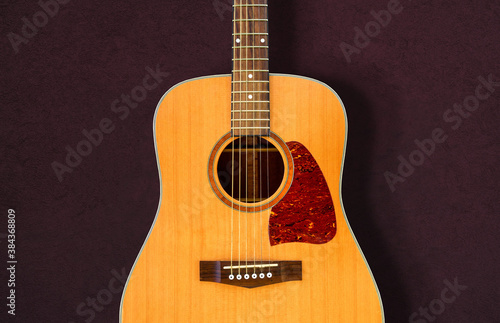 Fototapeta premium Acoustic guitar resting against a dark wall