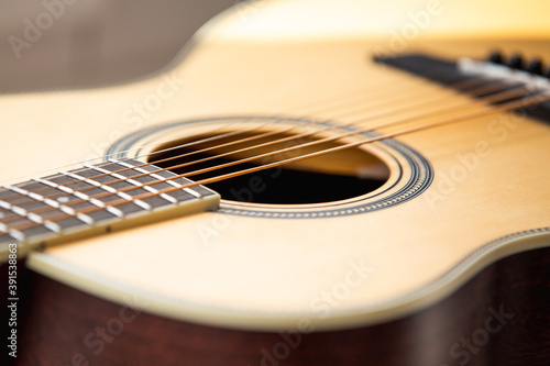 Fototapeta premium Acoustic guitar strings and sound hole close up