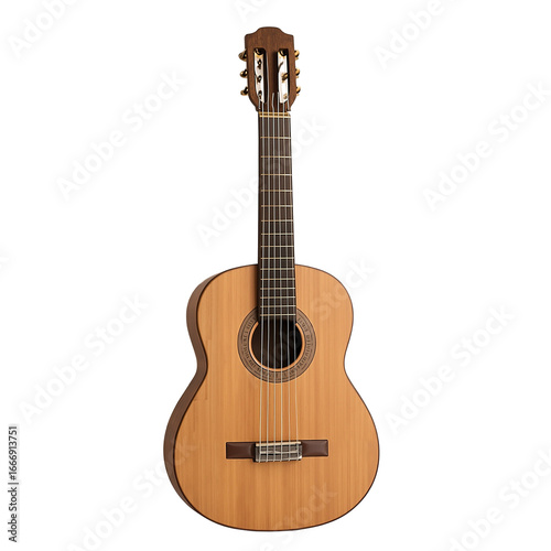 Obraz premium Acoustic guitar with wooden body and six strings on white background
