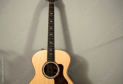 Fototapeta premium Acoustig guitar lying on the grey wall