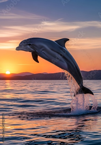 Obraz premium Acrobatic Dolphin Soaring Against Colorful Sky at Sunset over the Ocean