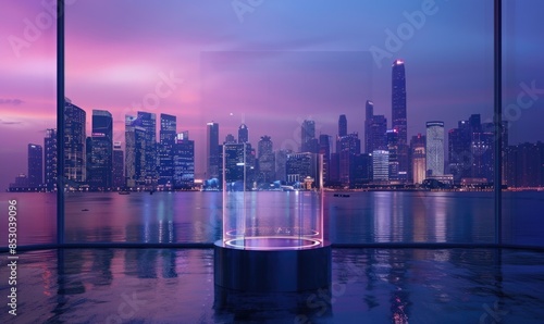Fototapeta premium Acrylic bloc with transparent design, city skyline backdrop