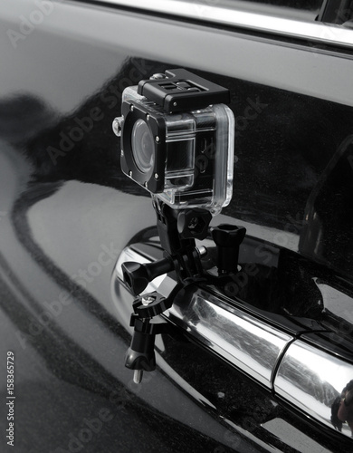 © Евгений Кожевников, Fototapeta premium action camera in the protective box is fixed on the car door handle