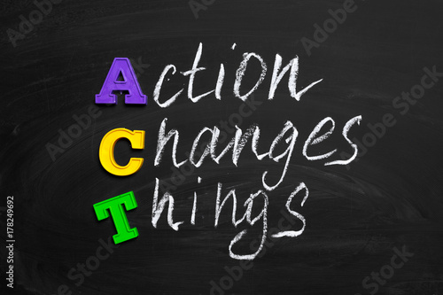 © fotofabrika, Obraz premium Action changes things text on chalkboard