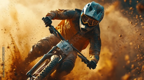 © dewi, Fototapeta premium Action shot of mountain biker in intense dirt jump