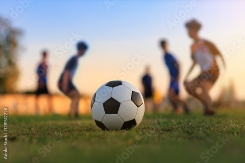 Fototapeta premium Action sport outdoors of kids having fun playing soccer football for exercise in community rural area under the twilight sunset sky.