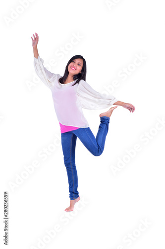 © shahrilkhmd, Fototapeta premium Active girl jumping in joy isolated on white
