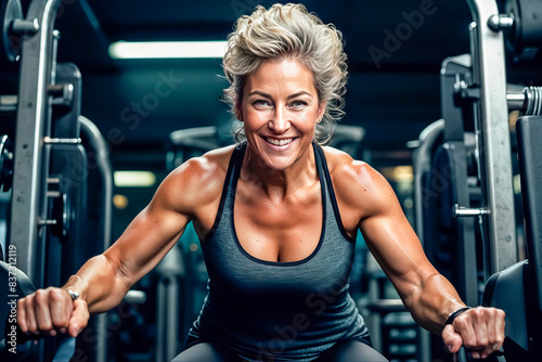 © abrilla, Obraz premium Active happy elderly woman doing sports in the gym