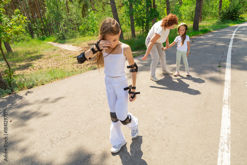 © Mariia, Fototapeta premium Active happy grandmother and granddaughters having fun time together skateboard in the forest.