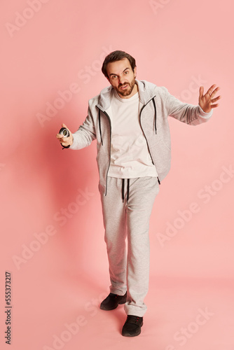 © Lustre Art Group , Fototapeta premium Active happy man with beard wearing home sportswear doing exercises isolated over pink background. Concept of active lifestyle, positive emotions, sport