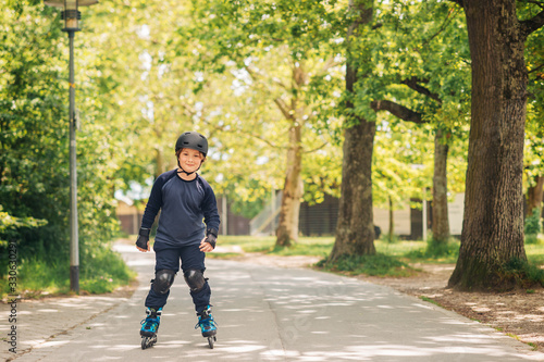 Obraz premium Active little boy skating in summer park, healthy lifestyle for children