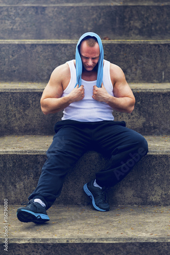 Fototapeta premium Active man resting after workout with towel.