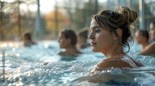 Obraz premium Active mature women enjoying aqua gym class in a pool, healthy retired...