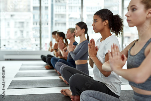© Svitlana, Obraz premium Active multiracial women practice yoga meditate on class