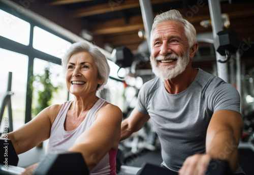 © CreativeArt, Obraz premium Active old age. An elegant middle-aged elderly couple leading an active lifestyle. They smile during classes in the tripod fitness room, after retirement.