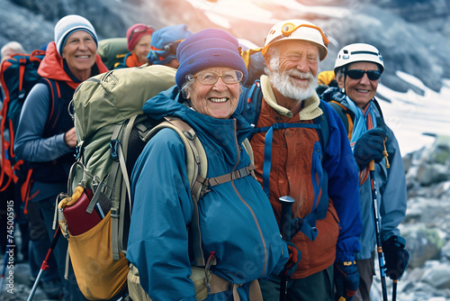 © SerPak, Obraz premium Active pensioners go mountaineering. group of elderly people with backpacks are climbing mountain.