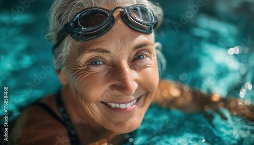© Tetiana, Fototapeta premium Active Retiree Enjoys Swimming On A Sunny Day, Smiling Out Of The Pool With Swimming Goggles And Cap In Hand.