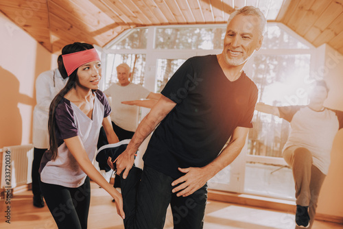 Fototapeta premium Active Retiree Nursing Home. Old Men do Exercises.