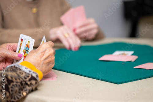 © herraez, Obraz premium Active retirement, group of elderly women having fun playing cards game at nursing home. High quality photography.