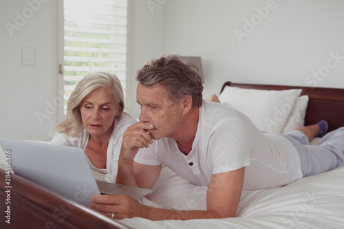 Obraz premium Active senior couple using laptop while lying on bed in bedroom at...