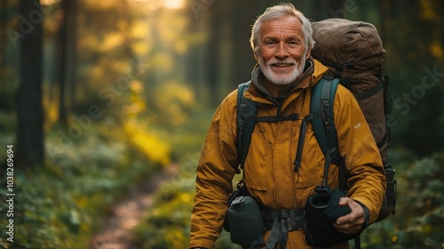 © Vadymation, Fototapeta premium Active Senior: Happy Hiker Enjoys Nature Trail in Golden Sunlight