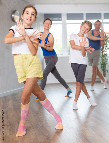 Fototapeta premium Active tween girl training dance positions with her parents and brother in light room during workout session