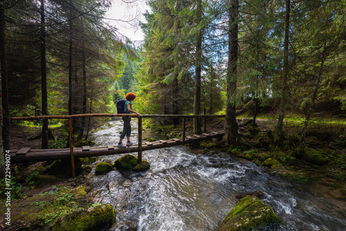 © Xalanx, Obraz premium Active woman crossing bridge over Ponor creek